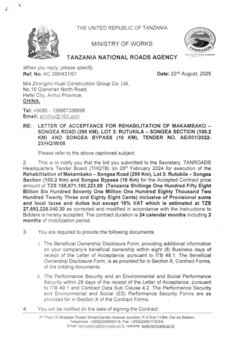 8月22日,中安华力正式收到坦桑尼亚国家公路局发来的中标通知书成功中标坦桑尼亚116公里道路建设工程项目,这标志着公司在坦桑尼亚基建市场再获关键性进展。