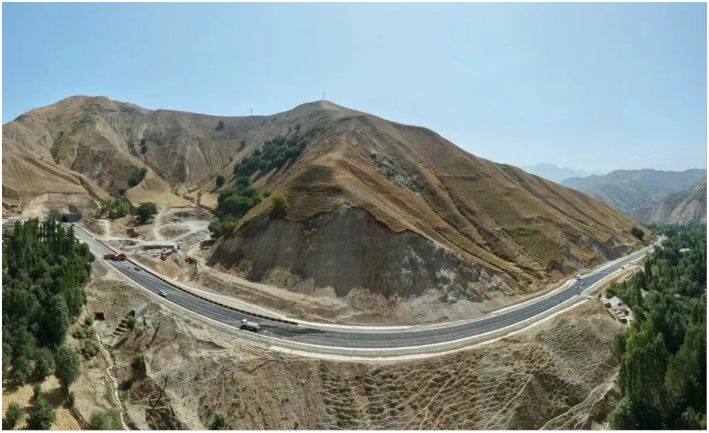 该公路全长75公里,路面标准宽度为12米,分三个合同段实施,其中由湖南路桥集团承建的第一合同段奥塔公路全长30.1公里,合同工期1200天,主要包括土石方460万m³、6座桥梁、2座隧道3.3公里、防护挡墙16万m³、30公里村道接线、沥青路面,以及交安、房建、照明等附属工程。自项目开工以来,面对疫情冲击、材料供应中断、劳工短缺及当地冬季极端低温等多重挑战,项目团队精准施策,通过优化施工设计方案,加强与当地政府、供应商的多维度协调保障资源供给,建立分阶段责任考核机制压实岗位责任,高效推进项目建设,成为塔吉克斯坦近年来首个严格按照合同工期达到通车条件的大型交通项目, 为集团深耕中亚市场奠定坚实基础。