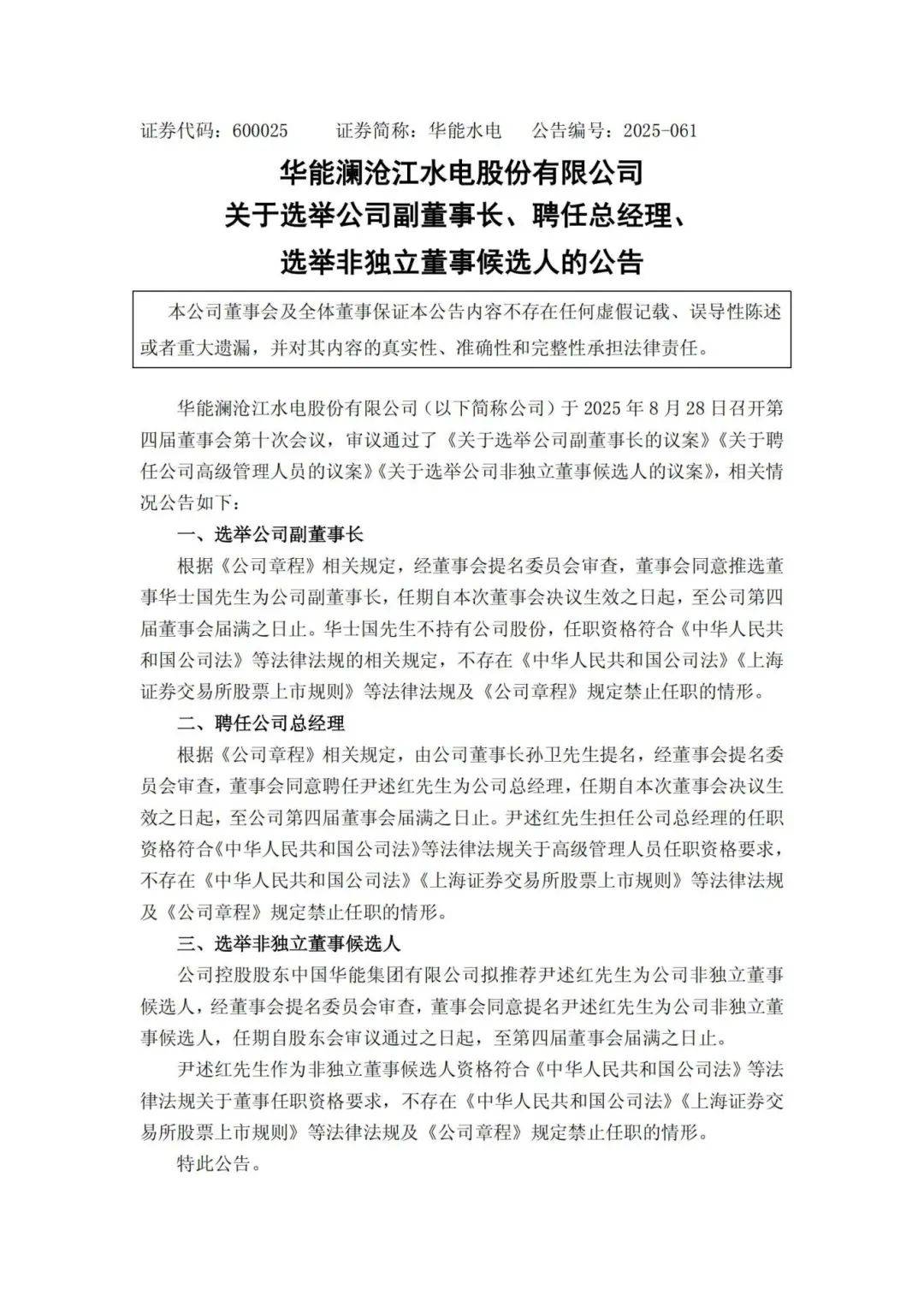 8月28日,华能澜沧江水电股份有限公司(以下简称“华能水电”)公告称,华能水电于8月28日召开第四届董事会第十次会议,审议通过了《关于选举公司副董事长的议案》《关于聘任公司高级管理人员的议案》《关于选举公司非独立董事候选人的议案》。