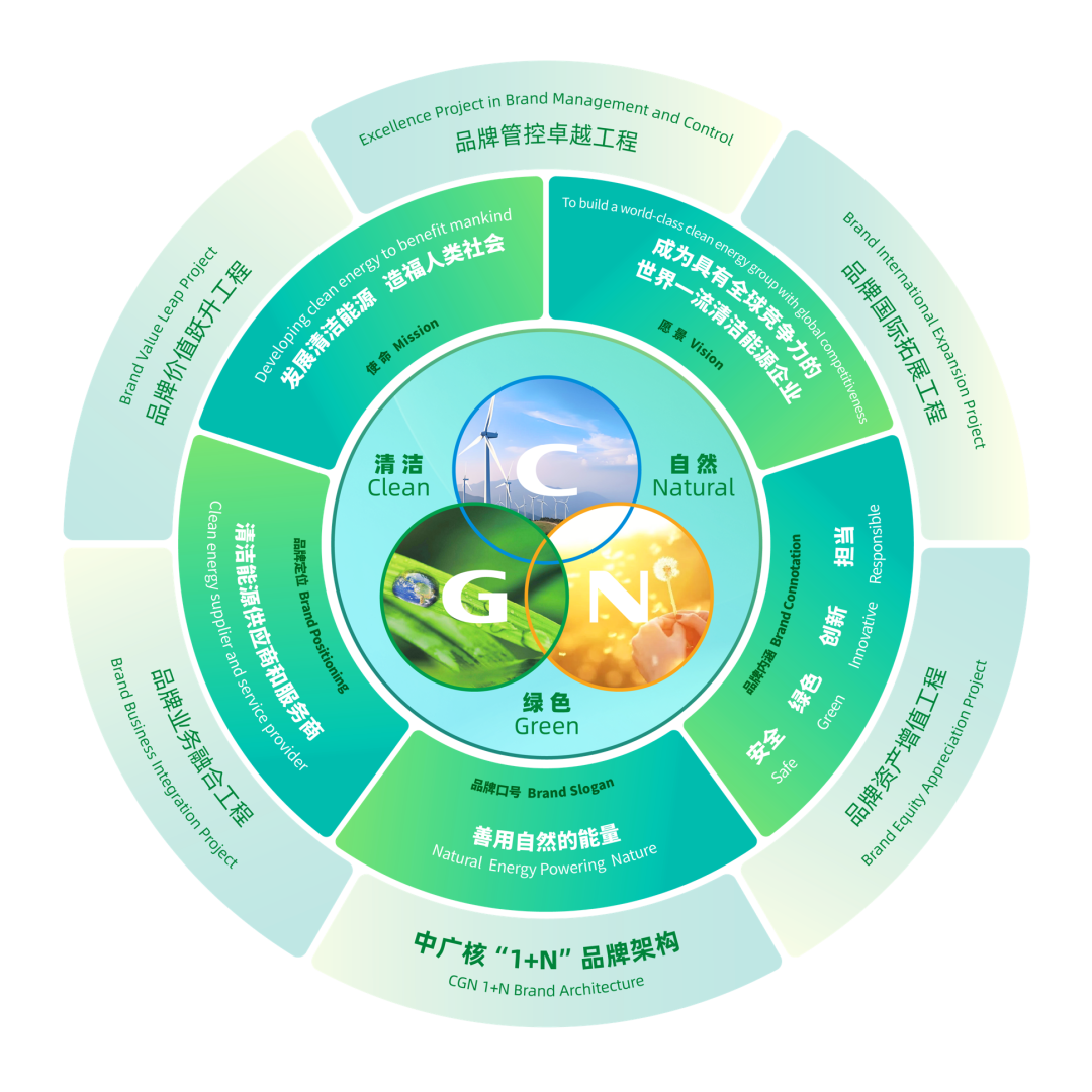 在集团母品牌“中广核”之下,集团“1+N”品牌架构划分两个层级:第一层是下属企业,采用集团主品牌下的单一品牌架构,充分发挥“中广核”母品牌增值带动作用;第二层是N,即各类产品、服务采用强背书模式,依托“中广核”母品牌,着力打造具有市场竞争力的科创产品,增强各类产品和服务的提质反哺作用,凝聚品牌发展合力。