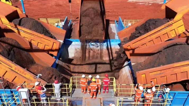 日前,赢联盟西芒杜矿山项目公司在D区采场顺利完成重载试车启动:重型矿卡有序将矿石卸入粗碎站卸料仓,经由D1#、D3#排料胶带机输送至D区粗矿堆。该关键流程的成功运行,标志着项目正式进入重载试运行阶段,为全面投产迈出决定性一步。