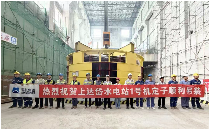 定子吊装是发电机组安装的“龙头工序”,其安装精度直接影响机组运行效率与稳定性。为确保定子顺利吊装,上达岱水电统筹协调各参建单位,周密部署、精心组织,通过对吊装方案反复论证推敲,在定子吊具强度、现场基础承载能力、运输路径空间余量等关键环节开展多轮周密核算与模拟演练,并现场引入高精度测量仪器监控吊装姿态,确保每一步操作绝对精准,最终高标准、高质量完成定子吊装工作。