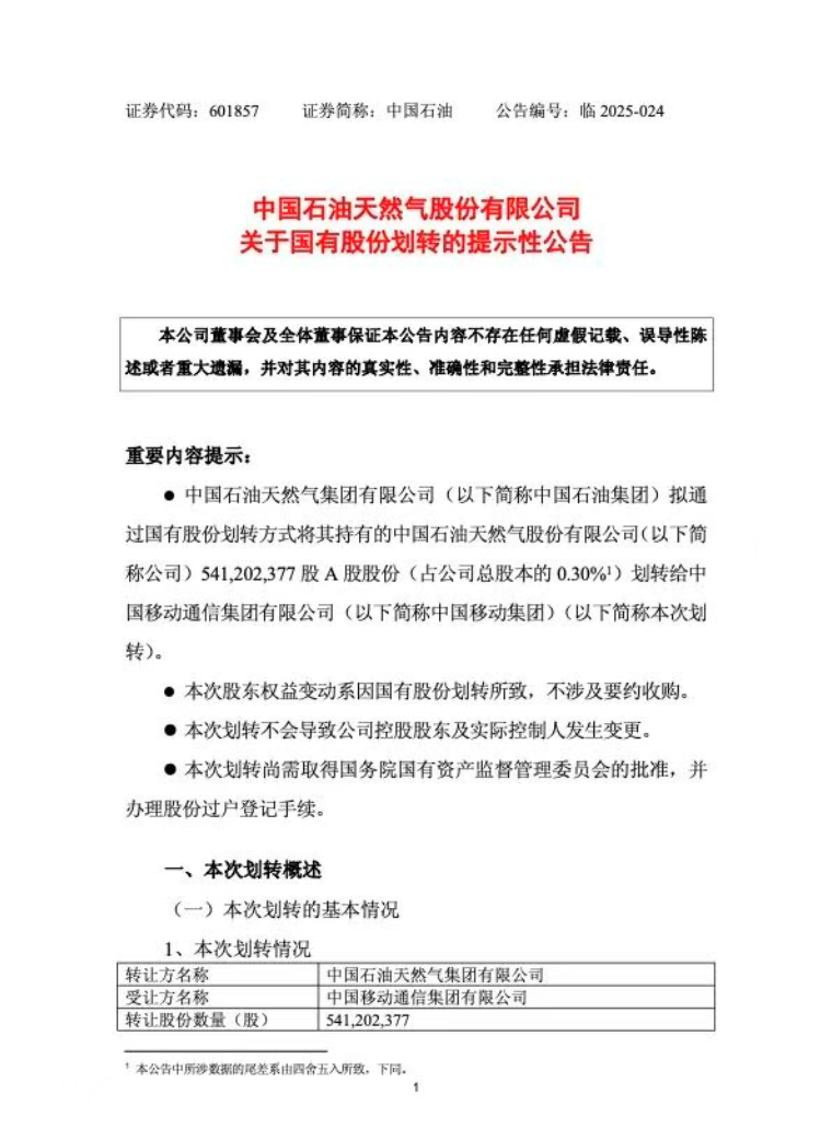 据公告,中国石油的控股股东——中国石油天然气集团有限公司(简称中国石油集团)拟通过国有股份划转方式,将其持有的中国石油的541202377股A股股份(占中国石油总股本的0.3%)划转给中国移动通信集团有限公司(简称中国移动集团),转让价格为0元。