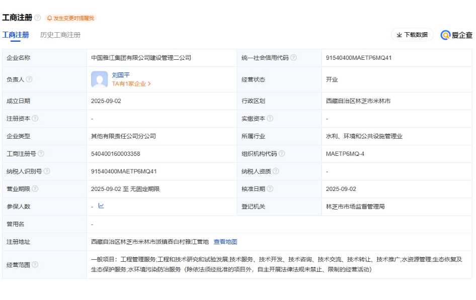 中国雅江集团有限公司建设管理二公司,负责人:刘国平,统一社会信用代码为91540400MAETP6MQ41,企业注册地址位于西藏自治区林芝市米林市派镇吞白村雅江营地,所属行业为水利管理业。