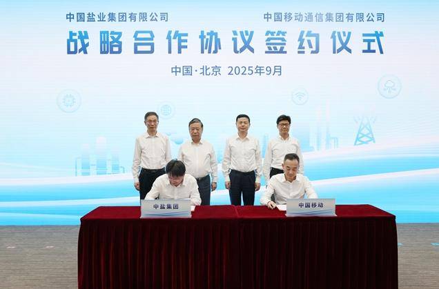 9月4日,中国移动通信集团有限公司与中国盐业集团有限公司在北京举行战略合作协议签约仪式。中国移动董事长杨杰、总经理何飚,中盐集团董事长李耀强、总经理李建忠,以及两家企业外部董事张雯出席签约仪式。中国移动副总经理陈怀达与中盐集团副总经理王云分别代表双方签订协议。