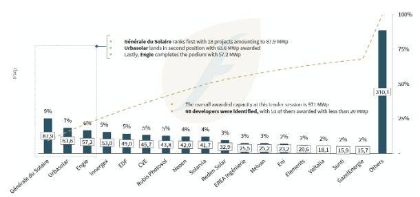 根据咨询公司 Finergreen 的数据,获得最大份额的开发商分别是Générale du Solaire(87.9 兆瓦)、Urbasolar(63.9 兆瓦)、Engie(57.2 兆瓦)、Innergex(53 兆瓦)、EDF(49 兆瓦)、CVE(45.7 兆瓦)和Rubis Photosol(43.8 兆瓦)。
