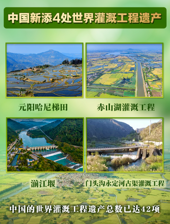 据央视新闻报道,9月10日,在马来西亚吉隆坡召开的国际灌排委员会第76届国际执行理事会会议上,2025年世界灌溉工程遗产名录正式公布,中国申报的云南元阳哈尼梯田、江苏句容赤山湖灌溉工程、四川彭州湔江堰、北京门头沟永定河古渠灌溉工程全部成功入选。