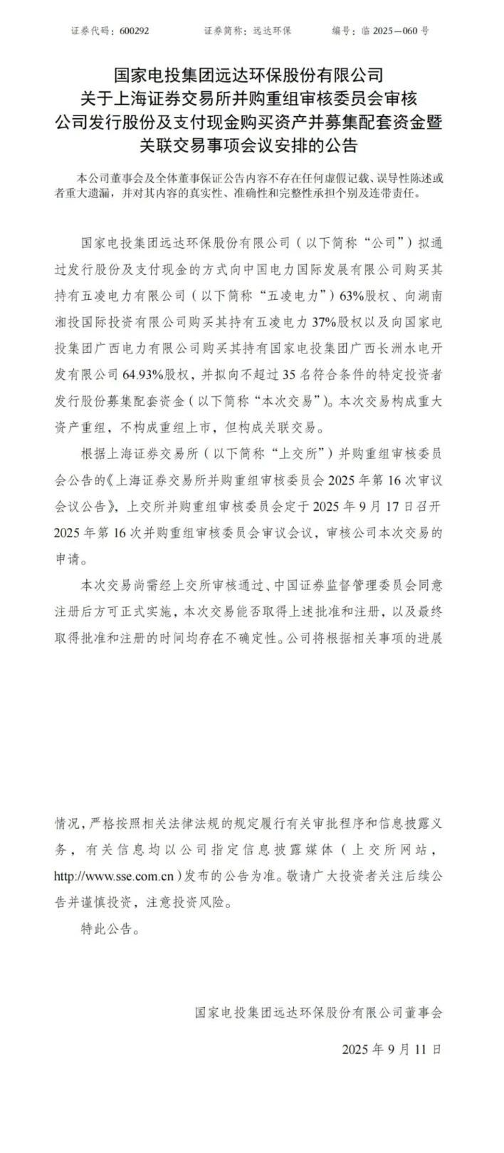 9月11日,远达环保发布公告称,根据上交所并购重组审核委员会公告,上交所并购重组审核委员会定于9月17日召开2025年第16次并购重组审核委员会审议会议,审核公司重大资产重组的申请。