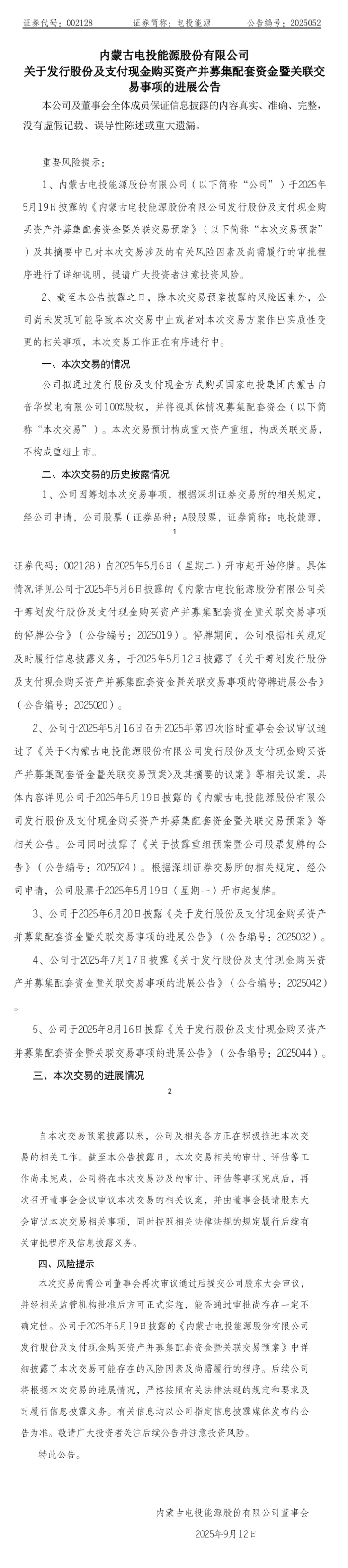 9月15日,电投能源发布公告称,公司拟通过发行股份及支付现金方式购买国家电投集团内蒙古白音华煤电有限公司100%股权,并将视具体情况募集配套资金(以下简称“本次交易”)。本次交易预计构成重大资产重组,构成关联交易,不构成重组上市。