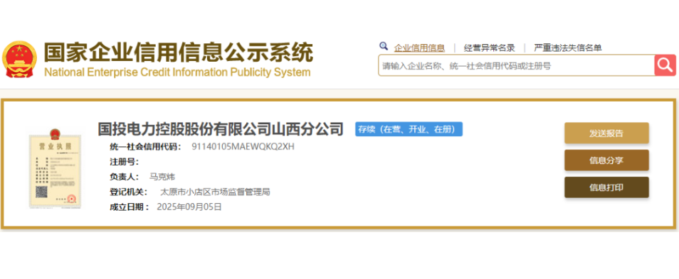 国家企业信用信息公示系统显示,日前,国投电力控股股份有限公司山西分公司成立,负责人马克炜,企业类型为股份有限公司分公司(上市、国有控股)。