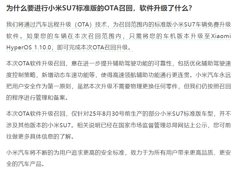 小米汽车称,永远把用户安全作为第一原则,虽然本次升级不需要物理更换任何零件,但公司仍按照召回的程序进行管理和备案。本次OTA软件升级召回,仅针对25年8月30号前生产的部分小米SU7标准版车型,并不涉及其他版本的小米SU7。