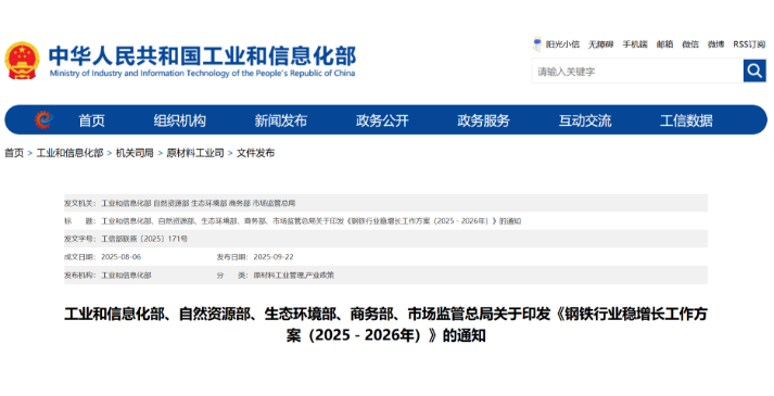 工业和信息化部、自然资源部、生态环境部、商务部、市场监管总局关于印发《钢铁行业稳增长工作方案(2025-2026年)》的通知