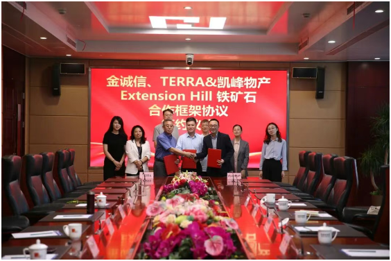 9月24日,金诚信股份及其子公司Terra Mining与宁波凯峰物产有限公司在金诚信总部大厦就Terra Mining运营的Extension Hill铁矿石项目签署合作框架协议。金诚信股份董事长王青海,金诚信集团总裁兼Terra Mining董事长彭怀生、集团财务总监尹师州;宁波凯峰物产有限公司总经理戴建东、总经理助理郑亚芬出席签约仪式。
