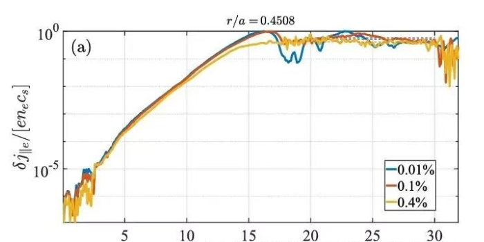 得益于GEM代码中任意波长求解方法,研究团队得以解析出仅相当于离子拉莫尔半径宽度的“电流尖峰”——这是一种紧贴有理面的径向电流结构。在单模模拟、比压β从0.01%升至0.4%的过程中,电流的强度几乎保持恒定,因此在这个范围之内,湍流驱动电流的幅度对电磁效应不敏感。单模结果显示,在线性阶段,湍流驱动电流主要由动量通量的散度驱动,尤其是其静电组分,而湍流加速项在所研究的β区间均保持次要地位;同时,在线性阶段中,尽管电流的驱动始终由动量通量的散度的静电分量占主导,但是动量通量的散度项和湍流加速项内部的电磁分量都随着电磁效应的增强而增强。更为细致的相空间诊断揭示,湍流驱动电流主要由通行粒子贡献,且随着电磁效应的增加,相空间的结构在平行速度的方向上愈加对称。在多模模拟中,湍流电流呈现更为丰富的径向分布,更引人注目的是,在某些特定的位置,湍流驱动电流密度可达到平衡电流密度的同一量级,同时在某些特定的位置,其幅度会超过靴带电流。这一结果意味着,即便在文中研究的无碰撞极限下,湍流驱动电流足以在湍流的时间尺度下显著改变安全因子剖面,值得进一步深入研究。
