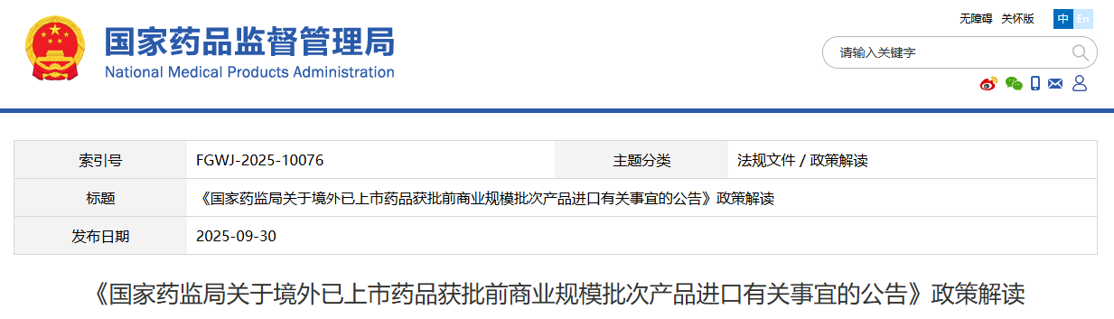 2025年9月30日,国家药监局发布公告,明确境外已上市药品在中国获批上市后,符合要求的获批前商业规模批次产品可进口并上市销售。