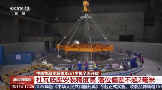 据央视新闻,10月1日,位于安徽合肥的紧凑型聚变能实验装置BEST项目建设取得关键突破。BEST装置主机关键部件——杜瓦底座研制成功并顺利完成交付,成功精准落位安装在BEST装置主机大厅内,标志着项目主体工程建设步入新阶段。