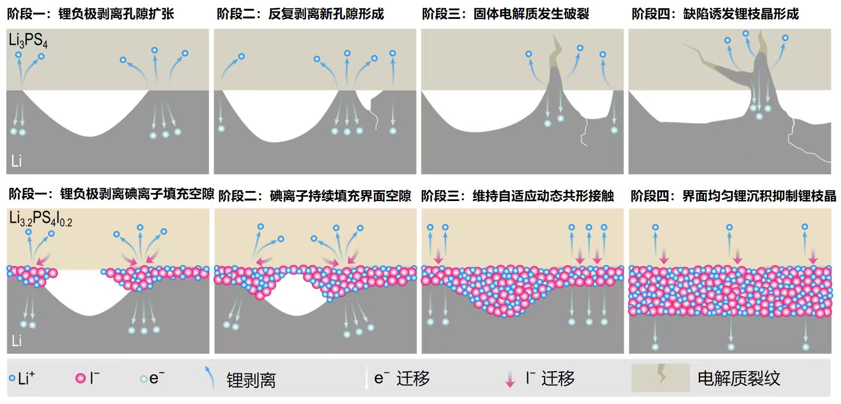 为了解决这一难题,研究团队开发出一种新技术:他们在硫化物电解质中引入了碘离子。在电池工作时,这些碘离子会在电场作用下移动至电极界面,形成一层富碘界面。这层界面能够主动吸引锂离子,像“自我修复”一样自动填充进所有的缝隙和孔洞,从而让电极和电解质始终保持紧密贴合。