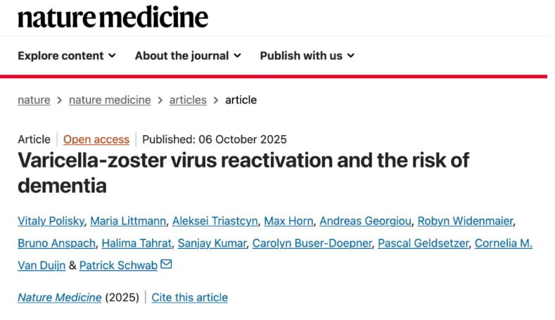 10月6日,《Nature Medicine》的研究报道“Varicella-zoster virus reactivation and the risk of dementia”,为我们揭开这层迷雾提供了迄今为止最有力的证据。这项研究并非蜻蜓点水,而是基于超过一亿人的健康记录,进行了一场规模宏大、设计巧妙的流行病学调查。通过层层推理和严谨的证据链,将VZV的再次激活与痴呆风险紧密地联系在一起,并指出了一条潜在的可干预路径。