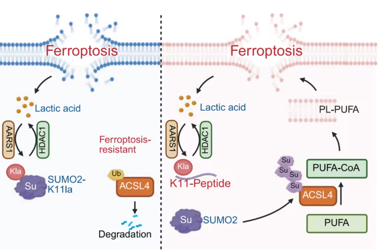 进一步功能检测表明,SUMO2-K11 乳酸化修饰(SUMO2-K11la)作为对铁死亡诱导反应中乳酸化水平显著升高的关键因素,是决定铁死亡抗性的关键所在。Sumoylation 修饰蛋白质组学和免疫共沉淀实验表明,SUMO2-K11la 会削弱 SUMO2 与 ACSL4 之间的相互作用。因此,这种干扰促进了 ACSL4 的降解,从而扰乱了脂质代谢,并有效地抑制了铁死亡。