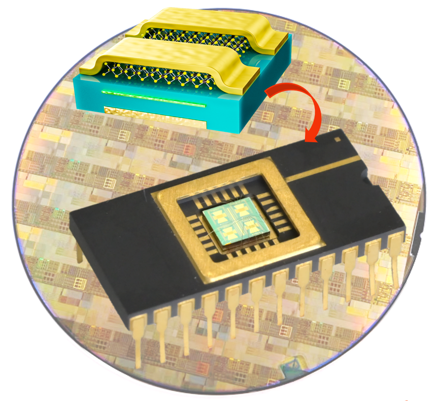 这也是为什么二维半导体研究者目前只能在极为平整的原生衬底上加工材料。一种解决思路是将CMOS的衬底“磨平”以适应二维材料,但要实现原子级平整并不现实。“我们没有必要去改变CMOS,而需要去适应它。”团队决定从本身就具有柔性的二维材料入手,通过模块化的集成方案,先将二维存储电路与成熟CMOS电路分离制造,再与CMOS控制电路通过高密度单片互连技术(微米尺度通孔)实现完整芯片集成。