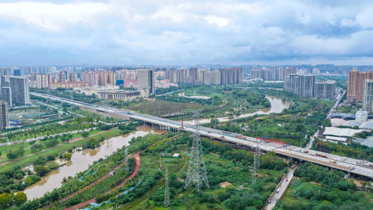 全长2.45公里的能源金贸高架桥横跨西咸新区能源金融贸易区,连接沣泾大道与沣河两大交通干线。施工团队经过22个月建设,完成1031根桩基施工、535片预制梁架设及6万余立方米现浇梁浇筑。该高速公路改扩建工程在建设过程中面临复杂施工条件,需要迁改23条高压线路和47处地下管线,同时需在运营中的地铁16号线隧道旁进行作业。