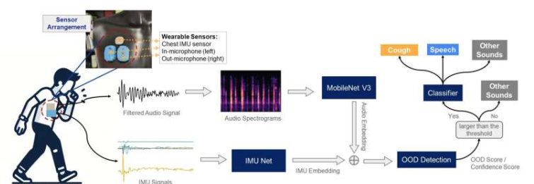 研究团队从佩戴于胸部的健康监测器中同步采集两类数据:一是环境音频信号,用于识别咳嗽声特征;二是加速度计记录的运动数据,捕捉咳嗽时胸部的突然振动。“单独依赖声音或运动均存在局限性,”论文第一作者陈宇涵指出,“例如,咳嗽与大笑可能产生相似的运动模式,但结合音频特征后,模型能更精准地区分两者。”研究显示,新算法在实验室测试中“假阳性”率显著低于传统模型,即被误判为咳嗽的非咳嗽声音大幅减少。这一改进得益于对现实场景中未标注声音的适应性训练,使模型能更灵活地应对未知噪音。