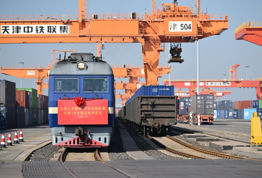 10月13日上午,一列满载冰箱、洗衣机、电视机、汽车配件等货物的中亚班列从天津集装箱中心站驶出,标志着由天津始发经霍尔果斯口岸的中亚班列首次纳入图定线路。该班列的开行是铁路部门推动上海合作组织天津峰会成果落实落地的一项重要举措。