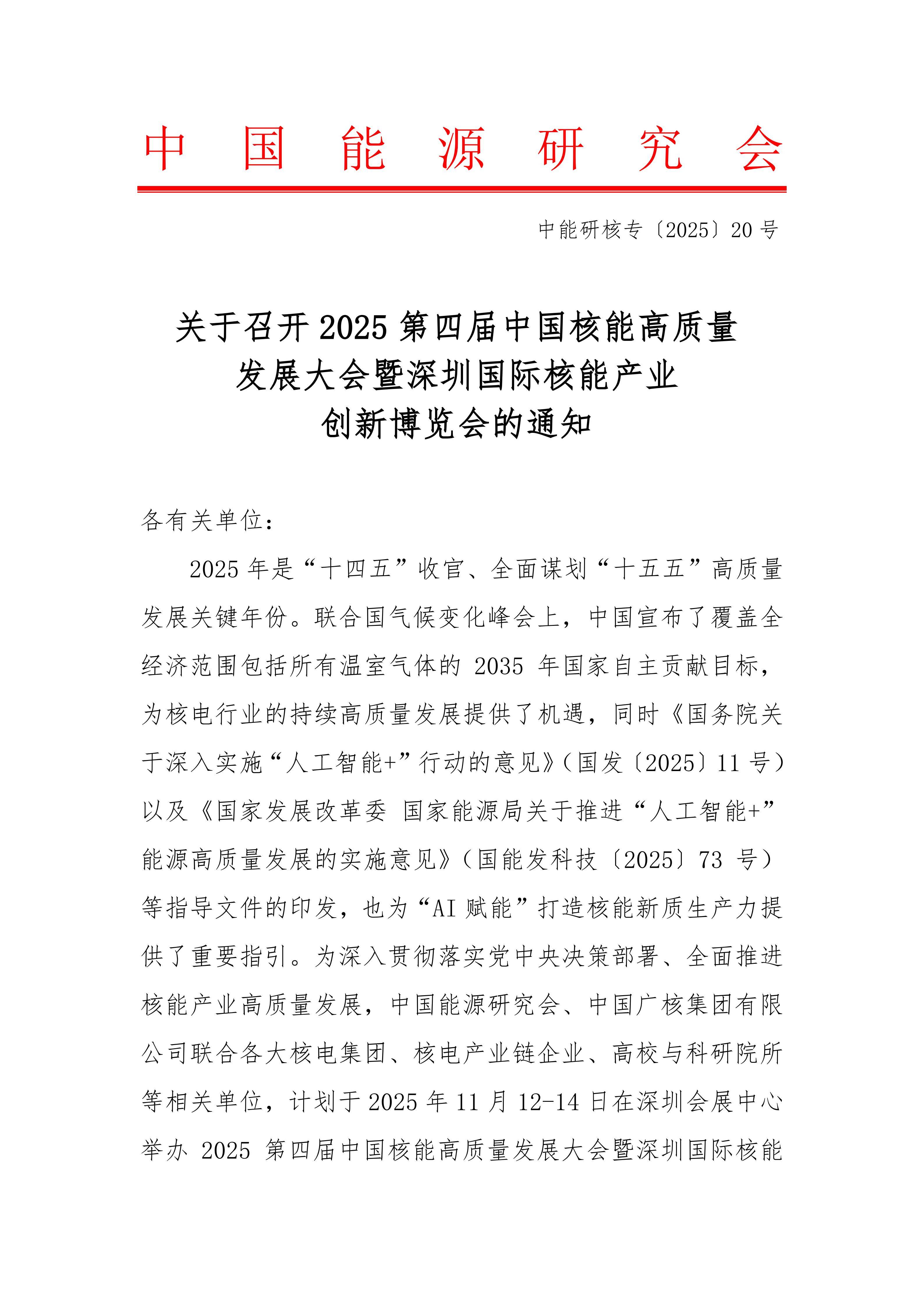 关于召开2025第四届中国核能高质量发展大会暨深圳国际核能产业创新博览会的通知