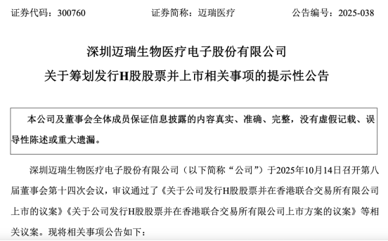 10月14日晚间,迈瑞医疗(300760.SZ)以连发28份相关公告的方式,正式宣布赴港IPO相关事宜。