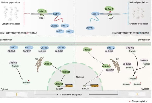 近日,中国农业科学院棉花研究所和西部农业研究中心等单位合作,系统解析了支架蛋白GhTTL启动子的自然变异调节棉纤维伸长分子机制,阐明了棉纤维长度自然变化的分子基础,为棉花分子遗传改良提供了候选靶点。相关研究成果发表在《植物通讯》上。