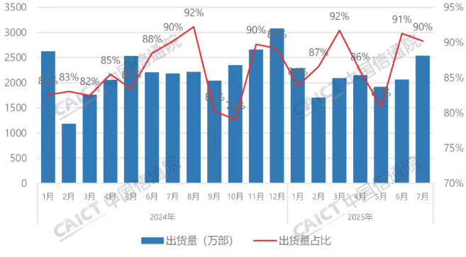 2025年7月,国内市场手机出货量2809.3万部,同比增长16.1%,其中,5G手机2262.1万部,同比增长9.5%,占同期手机出货量的80.5%。