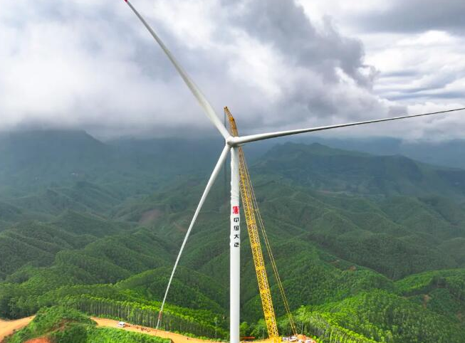 项目建设在黎塘镇山脊线区域,风机海拔落差超200米。开工以来,建设团队直面双重核心挑战。一是攻克山地施工“卡脖子”难题。风机分散位于陡峭山体,施工道路狭窄多弯。团队创新定制吊装设备支撑系统,解决倾斜地形重型机械稳定问题。针对主吊机转场难题,通过科学拆解配重、精细组装调试,克服单次转场耗时久、部分机位仅容1台吊机作业的效率瓶颈。二是创新应对极端天气干扰。7至9月雨季,项目遭遇暴雨、台风袭击,道路泥泞打滑、滑坡风险激增。团队建立“专人每日排查+动态调整路线”安全机制,创新实行“雨天暂停、错峰运输”模式,紧盯气象预警抢抓降雨间隙施工,在保障安全的同时最大限度推进工期。多措并举,首批机组如期并网发电,展现了总承包履约管理能力。