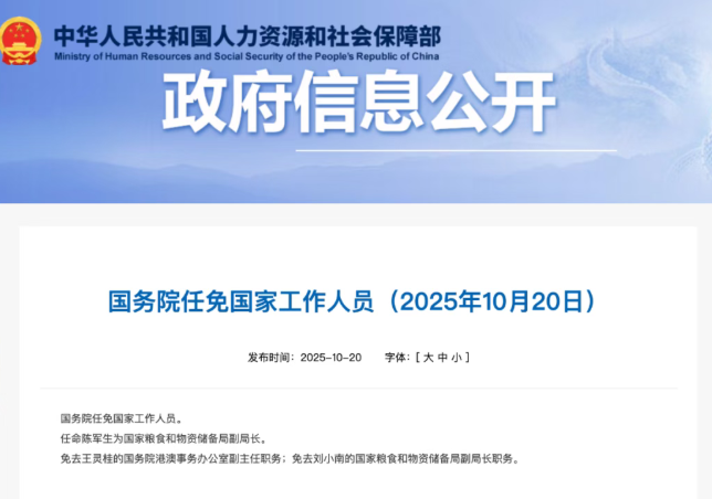 据人力资源和社会保障部网站10月20日消息,国务院任免国家工作人员:任命陈军生为国家粮食和物资储备局副局长。免去王灵桂的国务院港澳事务办公室副主任职务;免去刘小南的国家粮食和物资储备局副局长职务。