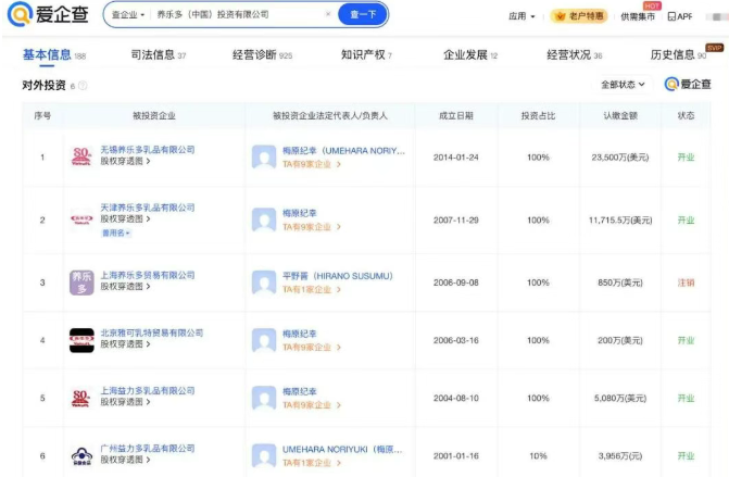 爱企查App显示,养乐多(中国)投资有限公司成立于2005年4月,法定代表人为梅原纪幸,注册资本约2.2亿美元,经营范围包括食品销售、食品互联网销售、日用品销售等。股东信息显示,该公司由日本国株式会社养乐多本社全资持股。