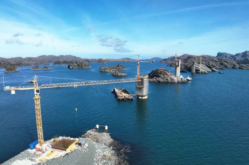 这些起重机通过多样化基础固定确保稳定性:三台高塔起重机分别安装在交叉底座及锚固于混凝土的坚固基础上;另一台则直接设于峡湾内的特制钢框架上,部分悬挑于水面并锚固至海底。建材通过船舶运输后,起重机直接从移动船体精准吊装至桥面,极端条件下仍能发挥全性能作业优势。