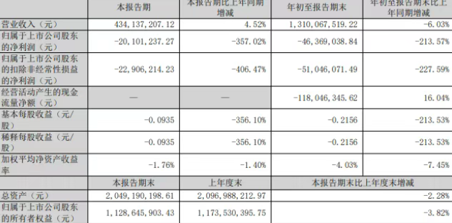 报告显示,前三季度公司实现营业总收入13.1亿元,同比下降6.03%;归母净利润亏损4636.9万元,上年同期盈利4082.71万元;第三季度实现营业收入4.34亿元,同比增长4.52%,归属于上市公司股东的净利润为-2010.12万元。