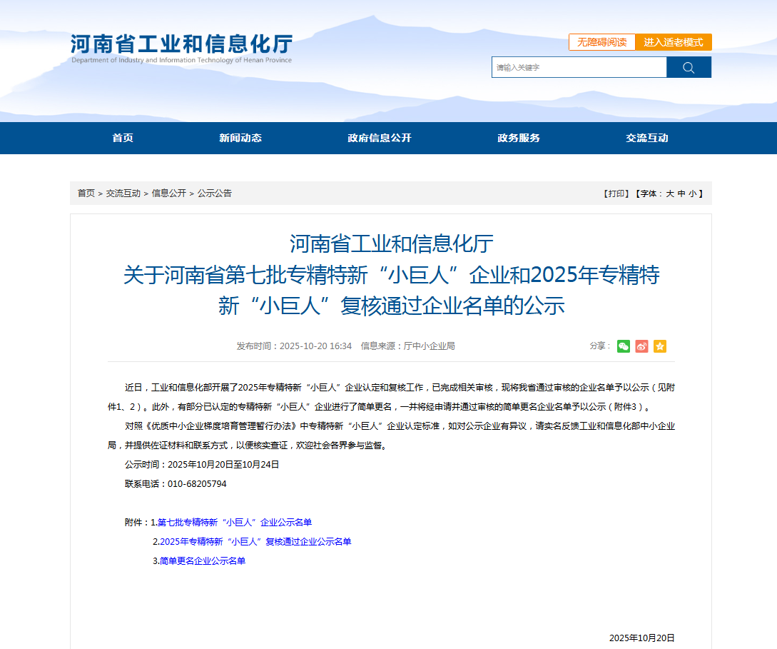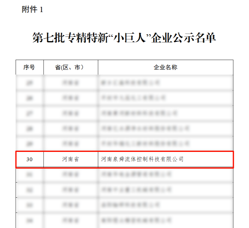 近日,工业和信息化部正式公布2025年河南省第七批专精特新"小巨人"企业认定名单,河南泉舜流体控制科技有限公司凭借在阀门领域深厚的技术积累和卓越的创新能力,成功入选国家级专精特新"小巨人"企业行列。