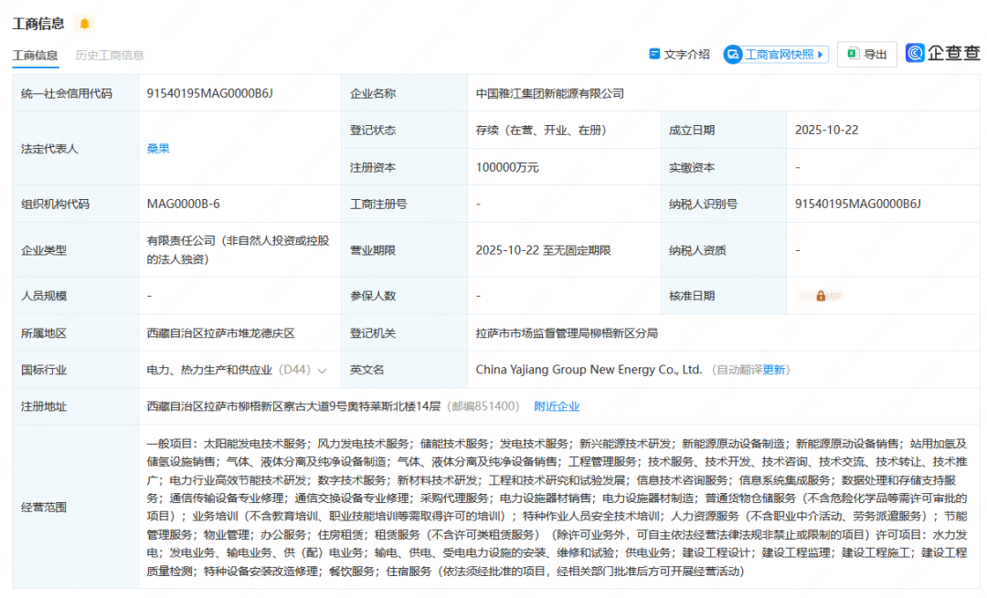 10月22日,中国雅江集团新能源有限公司成立,法定代表人为桑果,注册资本10亿人民币。股东信息显示,该公司由中国雅江集团有限公司全资持股。