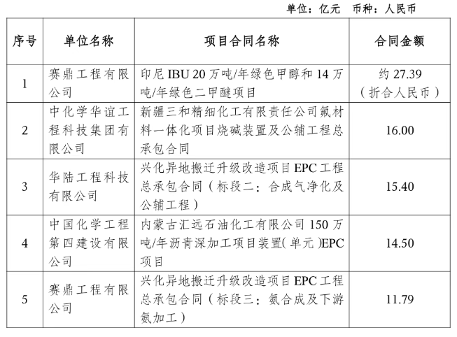 其中,9月,该公司单笔合同额在人民币5亿元以上的重大合同如下所示,另外,前9个月,中国化学5亿元以上的重大合同累计78个,在化工新材料这一领域,涉及浙石化、中海壳牌、海辰化学、甘肃巨化等企业。