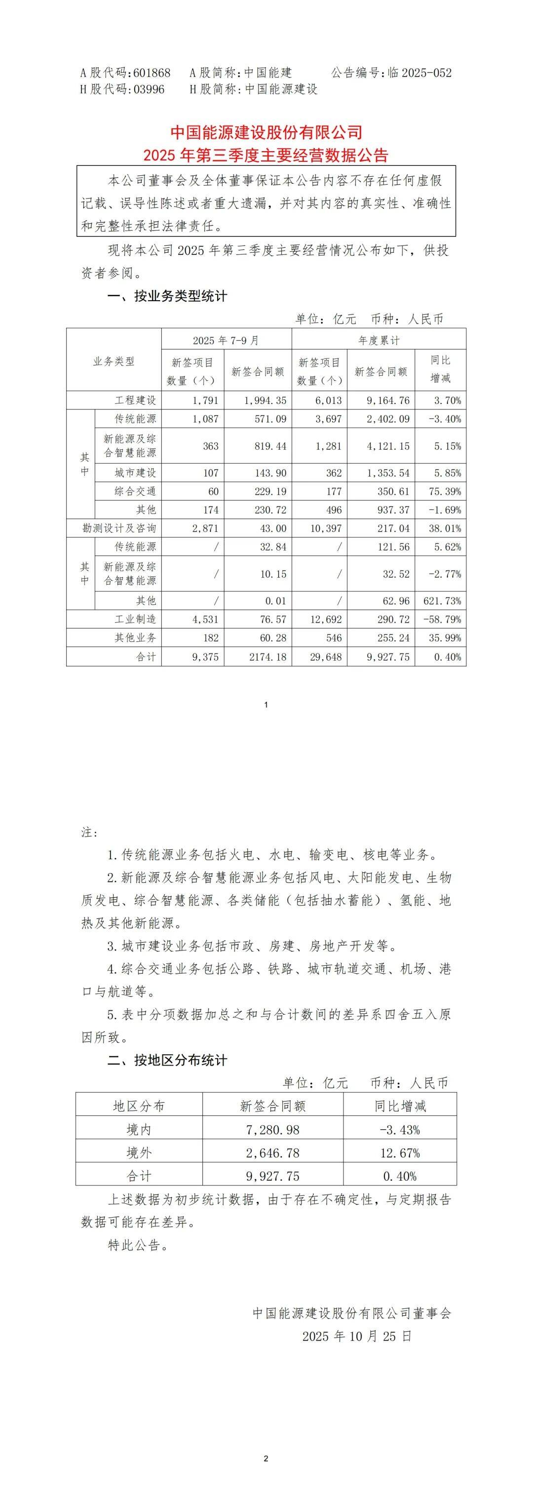 10月25日,中国能源建设股份有限公司发布2025年第三季度主要经营数据公告,2025年前三季度新签合同额9927.75亿元,同比增长0.4%。其中,工程建设类合同额9164.76亿元,同比增3.7%,勘测设计及咨询类217.04亿元,增38.01%,工业制造类290.72亿元。