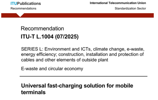 近日,由中国信息通信研究院(简称“中国信通院”)牵头,联合华为、OPPO、vivo公司撰写的标准L.1004《移动终端通用快速充电解决方案》(ITU—T L.1004, Universal fast-charging solution for mobile terminals)通过国际电信联盟电信标准化部门第五研究组(ITU-T SG5)审议并作为国际标准正式发布。这是ITU首次制定的全球通用快速充电标准。在标准“方案的最佳实践”部分中,中国自主创新的快速充电方案作为全球唯一的案例被推荐。中国通信标准化协会(CCSA)和电信终端产业协会(TAF)的双编号团体标准[T/CCSA 668|T/TAF 266-2025],[T/CCSA 394|T/TAF 092-2024]在参考文献中被引用。这标志着中国在消费电子充电技术领域实现了从跟随、参与到主导的重大跨越,对推动全球绿色环保和产业融合发展具有重要意义。