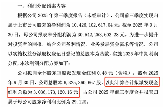 公司拟向全体股东每股派发现金红利 0.48 元 ( 含税 ) ,截至 2025 年 9 月 30 日,公司总股本 6,325,360,667 股,以此计算合计拟派发现金红利总额为 3,036,173,120.16 元,占公司 2025 年前三季度合并报表归属于母公司股东净利润比例为 29.12%。