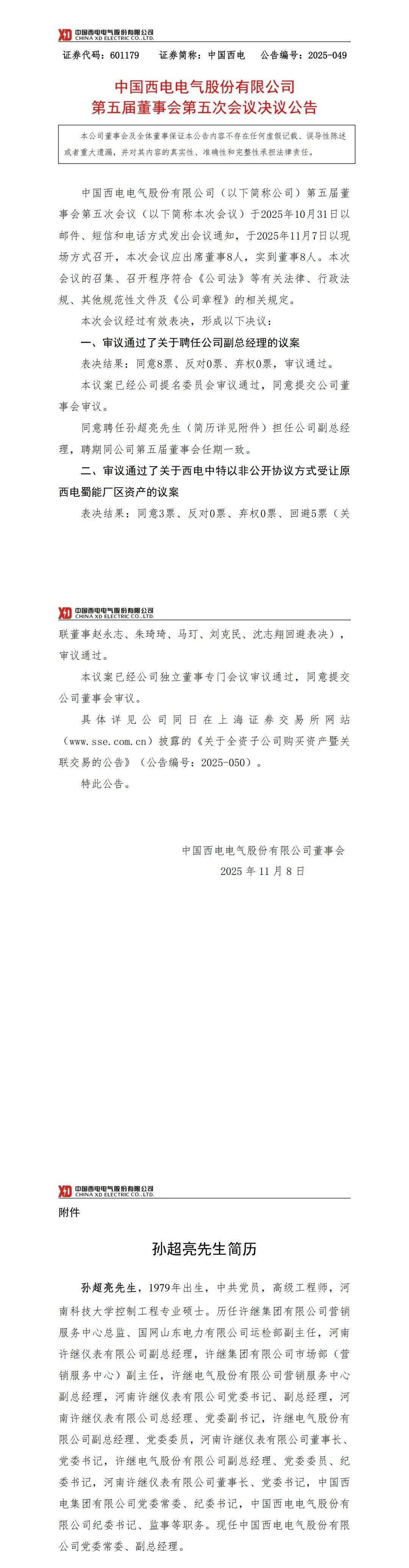 11月8日,中国西电发布公告,公司董事会审议通过了关于聘任公司副总经理的议案,同意聘任孙超亮先生担任公司副总经理,聘期同公司第五届董事会任期一致。
