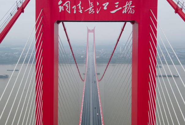中国首座双层斜拉悬索桥——铜陵长江三桥,于周四在安徽省铜陵市建成通车。该桥是安徽省境内跨越长江的第十一座跨江大桥,其公路段已于通车当日投入运营,段长11.9公里。
