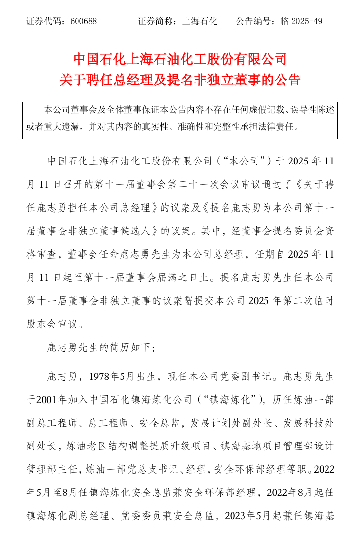 上海石化发布公告称,公司于11月11日召开的第十一届董事会第二十一次会议审议通过了《关于聘任鹿志勇担任本公司总经理》的议案及《提名鹿志勇为本公司第十一届董事会非独立董事候选人》的议案。其中,经董事会提名委员会资格审查,董事会任命鹿志勇先生为本公司总经理 ,任期自2025年11月11日起至第十一届董事会届满之日止。提名鹿志勇先生任本公司第十一届董事会非独立董事的议案需提交本公司2025年第二次临时股东会审议。