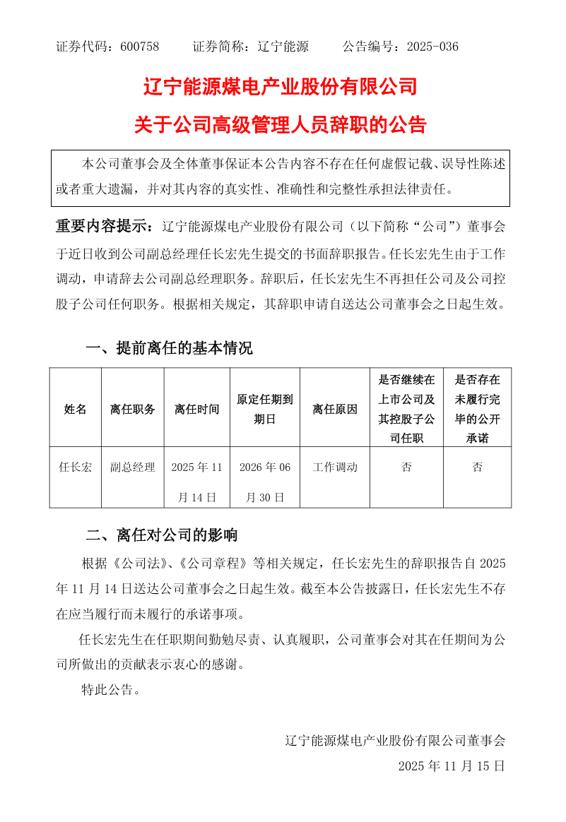 11月14日,辽宁能源发布公告称,公司董事会于近日收到公司副总经理任长宏先生提交的书面辞职报告。任长宏先生由于工作调动,申请辞去公司副总经理职务。辞职后,任长宏先生不再担任公司及公司控股子公司任何职务。