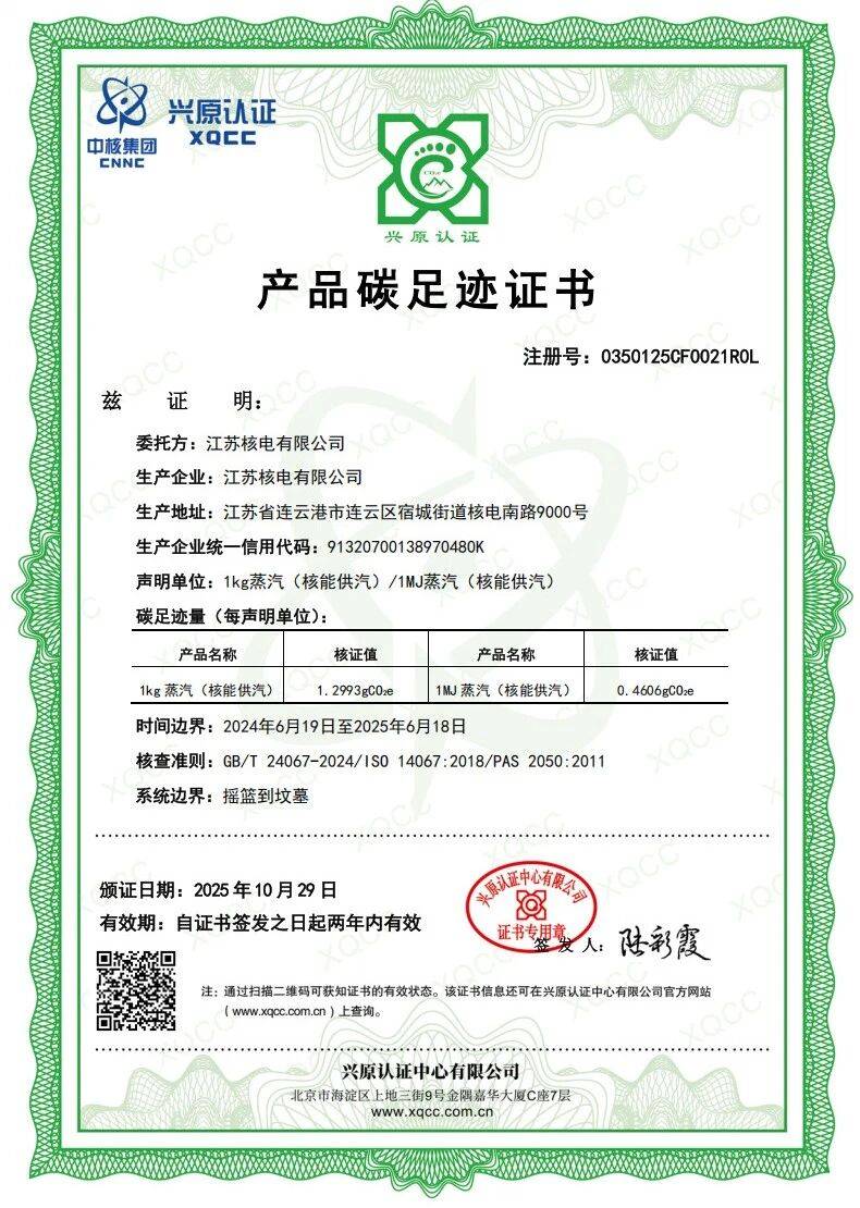 本次发布以江苏核电“和气一号”投产一周年为核算周期,按照国内国际产品碳足迹量化标准进行测算。数据显示,核能供汽碳足迹是燃煤热电联产蒸汽的1/600,是天然气热电联产蒸汽的1/100;核能供汽比化工蒸汽低碳优势更突出,比天然气更绿色。