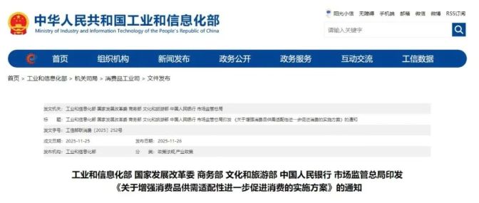 11月26日,工业和信息化部、国家发展改革委、商务部、文化和旅游部、中国人民银行、市场监管总局印发《关于增强消费品供需适配性进一步促进消费的实施方案》。方案指出,到2027年,消费品供给结构明显优化,形成3个万亿级消费领域和10个千亿级消费热点,打造一批富有文化内涵、享誉全球的高品质消费品。到2030年,供给与消费良性互动、相互促进的高质量发展格局基本形成,消费对经济增长的贡献率稳步提升。