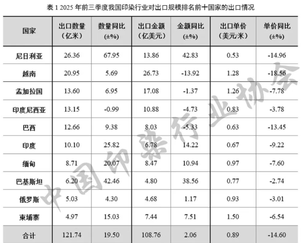 面对复杂的全球贸易环境,中国印染企业积极调整产品结构,持续拓展“一带一路”沿线国家和非洲等国际市场。前三季度,中国印染行业出口规模排名前十的国家出口数量121.74亿米,同比增长19.50%,高于整体增速7.20个百分点,其中,对尼日利亚、巴基斯坦、印度出口数量分别大幅增长67.95%、42.46%和25.82%,对缅甸和柬埔寨出口数量增速均高于对全球出口整体增速。对前十国家的出口平均单价降幅高于整体水平3.81个百分点,其中对越南、尼日利亚和巴西出口平均单价降幅分别达到18.56%、14.96%和13.45%。
