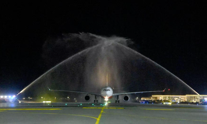 当地时间11月30日19时21分,随着中国东方航空MU2051航班降落在阿曼马斯喀特国际机场,首条由中国航空公司运营的中阿直飞航线顺利完成首航。马斯喀特国际机场当天为来自北京大兴国际机场的首航航班举行了隆重的“过水门”仪式。